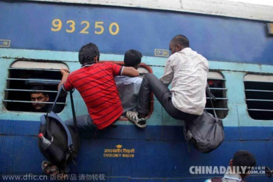 当地时间2014年7月20日,印度阿拉哈巴,参加铁路系统招聘考试的学生互相推挤着登上火车。印度铁路是世界上第九大商业雇主,拥有130万员工,每天运输乘客2300万人次。(图片:东方IC)