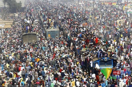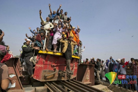 这一年度集会给孟加拉国的交通带来了巨大的压力,穆斯林返乡的火车严重超载,让人不禁为他们的安全问题捏把汗,乘客站在火车顶上,如同玩杂技一般。