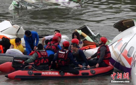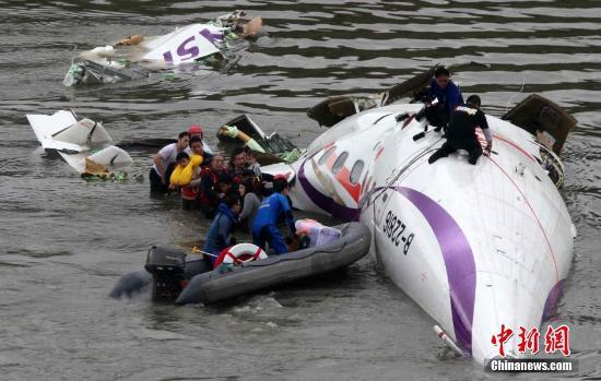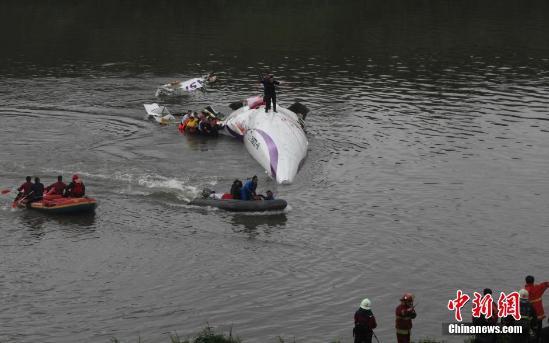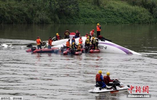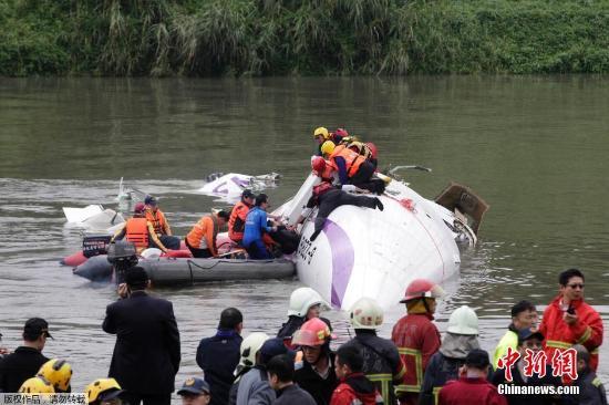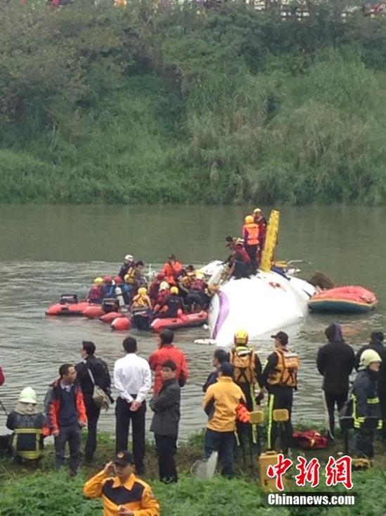 台湾复兴航空GE-235班机2月4日上午自台北松山机场起飞后于基隆河坠河。原定飞往金门的该班机上共有58人,其中厦门旅游集团国际旅行社有限公司组团的两个大陆观光团旅客31人。图为救援现场。中新社发 路梅 摄