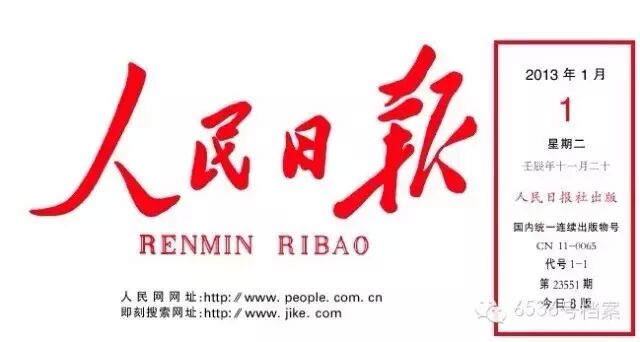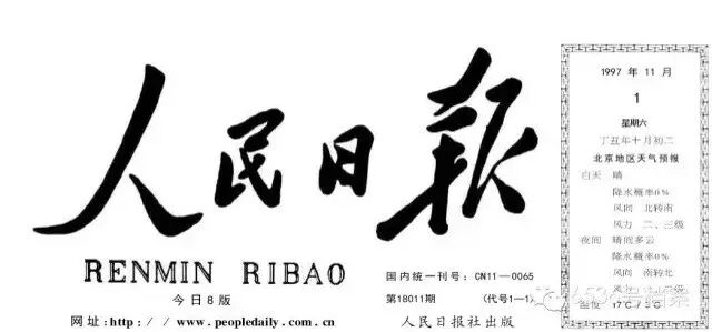 网址。随着时代的发展,人民日报的报头上也出现了网址。人民日报报头上第一次出现网址是1997年7月1日,出现了人民日报网络版网址www.peopledaily.com.cn,这个网址单独出现在报头“人民日报”四个字下面直到2000年10月27日。从2000年10月28日开始,在这个网址上面又出现了人民网网址www.people.com.cn,这两个网址陪伴着报头一直到了2005年3月31日。从2005年4月1日开始,手机人民网网址wap.people.com.cn取代了人民日报网络版的网址,和人民网网址一起“驻守”在这块地方,直到2012年底。2013年1月1日,即刻搜索www.jike.com取代了手机人民网网址,和人民网网址一起“守护”着四字报头,不过仅到当年的10月31日为止。从2013年11月1日到现在,我们在报头上看见的网址就仅有人民网网址www.people.com.cn一个了。从这里,我们似乎也能够管窥这份党中央机关报在传统媒体与新兴媒体融合发展中的进程。