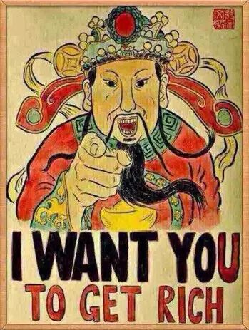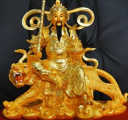 这位大叔头戴铁冠,手执铁鞭,面如黑炭,胡须四张,骑黑虎很是威风。在传统文化里,他与财富搭不上,却因为是招宝天尊、纳珍天尊、招财使者和利市仙官四名小财神的领导,所以大家都把他当做财神,他的这套班子,民间也称为五路财神,所以贴画上有时会出现五个人同时出现的场景。
