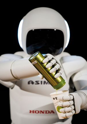 本田公司2014年推出的新一代仿人类机器人“阿西莫”(ASIMO)十分可爱。他不但会走会跑、上下楼梯,还会踢球、倒茶倒水,动作十分精准灵巧。