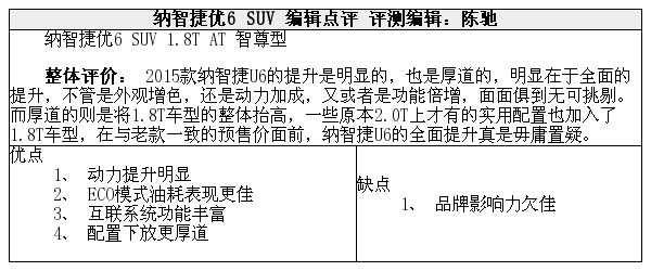 动力上,2015款纳智捷U6在原有基础上有较大提升,参数表现更抢眼,特别是1.8T车型动力提升明显,并且老款与之匹配的5速手自一体变速箱也升级为全系爱信6速手自一体变速箱,动力总成的综合表现可谓有质的提升。