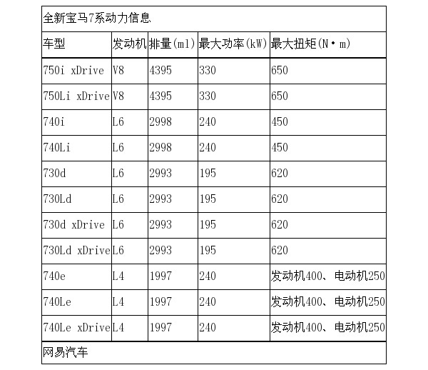 L6发动机。 740i与740Li车型所采用的TwinPower Turbo涡轮增压技术的直列六缸发动机出自宝马集团的最新一代动力系统。这款3.0升汽油发动机输出功率较前任发动机提高5kW,达到240kW。730d与730Ld车型配备同为3.0升排量的柴油发动机同样提高了5kW达到195kW的最大功率,最大扭矩达到620N·m。此外,这款柴油发动机的声学舒适性也达到新高度。