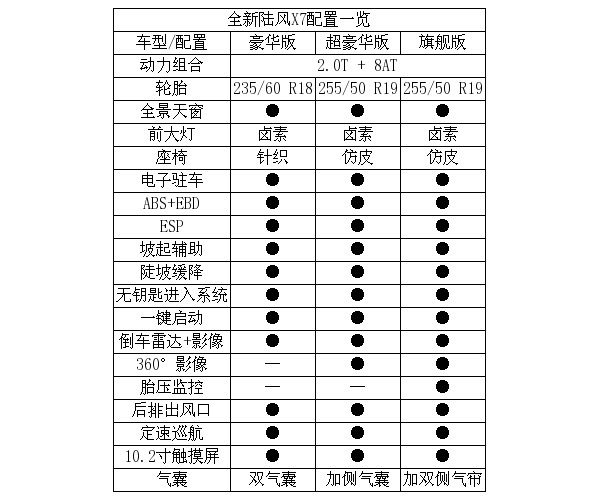 根据官方最新发布的配置信息来看,全新陆风X7将推出豪华版、超豪华版、旗舰版三种版本。具体配置如下: