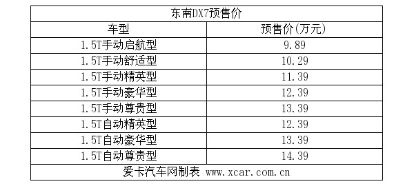 很多网友都知道,东南3.0战略首款SUV车型东南DX7早在2014年广州车展就已经正式亮相。不久前,国内媒体又曝光了东南SX7的预售价区间,新车或分为8款车型,预售价区间或为9.89万-14.39万元,并将于7月25日正式上市。