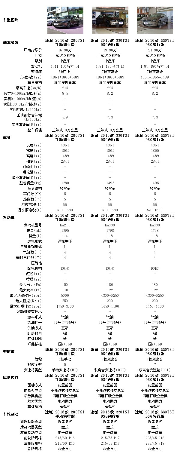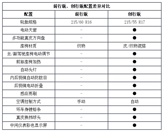 前行版是全新速派的入门版车型,分手动和自动两款,除了变速箱不同外,其它配置均一样,两者相差一万元,上表列了一些亮点配置,这几个配置一般在入门版车型上是不会配备的,全新速派能配上这几个非常实用的装备还是挺不错的,但毕竟是入门版,它是全系唯一一款使用16英寸轮圈的车型,所以在外观上很容易被认出来,而在内饰方面,它使用的是织物座椅,手动空调,也没有多功能真皮方向盘和中控大屏,但结合其16.98万元的起售价再加上能有上表列的那几个配置我认为已经非常厚道了,非常适合想要以较低价格买一辆中型车的消费者。