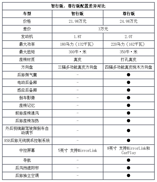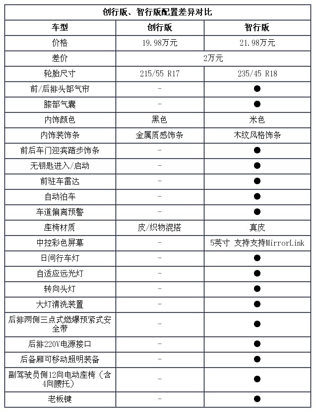全新速派从智行版车型上开始配备日间行车灯和235/45 R18的轮圈,车内增加了自动泊车、车道偏离预警和5英寸中控屏幕等一些科技配置,还多了前排头部气囊、膝部气囊以及车道偏离预警等安全配置,和之前的车型相比,从外观、内饰、舒适性配置、安全配置方面有了一个全面提升,而且只和之前的创行版相差2万元,性价比非常突出。