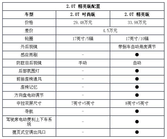精英版车型上的前排座椅通风、座椅记忆、驾驶席电动便利上下车系统以及摆页式空调出风口都是很能提升档次的配置,但它要比2.0T时尚版贵了4.5万元,相对于这个差价,它的性价比并不是很高,除非你是对这些配置有特别大的需求,否则不建议购买。