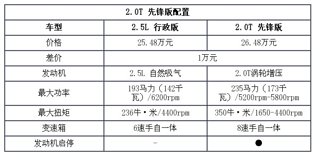 2.0T先锋版是2.0T车型的入门版,它除了增加了启停系统外,其他配置都和2.5L行政版一样,没有真皮方向盘、没有真皮座椅,但因为采用了更先进的动力总成,售价要比2.5L车型贵了1万元,2.0T涡轮增压发动机的数据参数要全面超越2.5L自然吸气发动机,还配备了8速手自一体变速箱,如果你对动力需求大,那我认为这一万元很值。