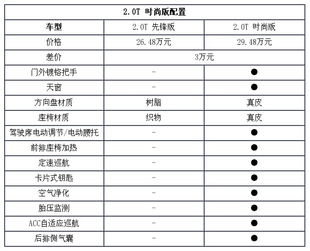 2.0T时尚版已经有了前排座椅加热、胎压监测、自适应巡航等装备,其配置能够满足一个中大型车用户的基本需求,而不到30万元的售价让其在同级别车型中有较强的竞争力,经过上面的配置分析,这款车是整个车型中性价比最高的。
