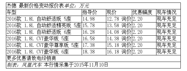 凤凰汽车讯 价格信息:近日,凤凰汽车区域编辑从北京地区运通博泰经销商处获悉,目前该店本田杰德车型有大量现车在售,购车可优惠2.2万元。对这款车感兴趣的朋友们不妨进一步关注一下。具体价格请详见下表: