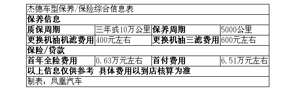 保养费用:杰德车型享受三年或10万公里整车质保。常规保养周期为每5000公里更换一次机油、机滤,费用在400元左右。更换机油、三滤的费用在600元左右,此保养费只作为参考依据,因为不同的保养材料会造成保养费用的差异。具体费用根据车型不同以到店核算为准。