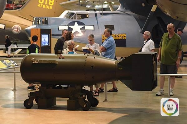 2015年8月6日,在美国俄亥俄州的美国国家空军博物馆,游客观看同型号但已拆除核心部件的原子弹“小男孩”。美军1945年8月6日向日本广岛投放代号为“小男孩”的原子弹。(新华社记者殷博古摄)