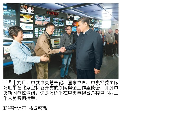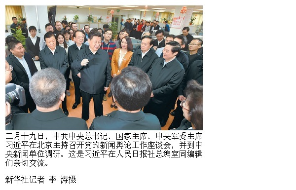 当天下午,习近平在人民大会堂主持召开党的新闻舆论工作座谈会。会上,人民日报社社长杨振武、新华社社长蔡名照、中央电视台台长聂辰席和编辑代表范正伟、记者代表李柯勇、主持人代表康辉分别发言,他们谈认识、讲工作、提建议,习近平边听边记,不时插话交流。