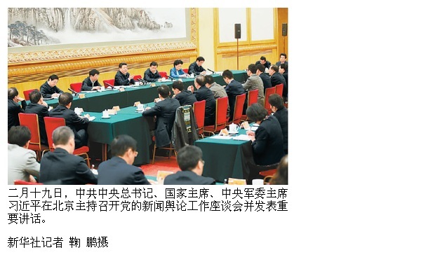 本报北京2月19日电 (记者杜尚泽)中共中央总书记、国家主席、中央军委主席习近平19日在北京主持召开党的新闻舆论工作座谈会并发表重要讲话。他强调,党的新闻舆论工作是党的一项重要工作,是治国理政、定国安邦的大事,要适应国内外形势发展,从党的工作全局出发把握定位,坚持党的领导,坚持正确政治方向,坚持以人民为中心的工作导向,尊重新闻传播规律,创新方法手段,切实提高党的新闻舆论传播力、引导力、影响力、公信力。