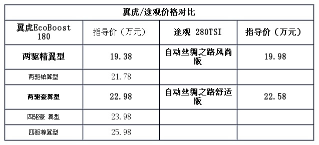 [汽车之家对比测试] 长安福特翼虎和上汽大众途观可以说是国内合资品牌紧凑级SUV中关注度极高的两款车型,同时也市场中征战多年,是名副其实的两员老将。就在今年,翼虎完成了中期改款,除了换装了全新家族前脸外,还对车内诸多细节进行了调整。而途观呢,在即将迎来换代之际,推出了搭载1.4T涡轮增压发动机+双离合器变速箱的“丝绸之路版”车型,进一步拉低“自动挡”车型的售价。而趁着购置税减免政策还只剩下半个月之际,今天我们就一起来聊聊它俩的入门级车型,表现到底如何?