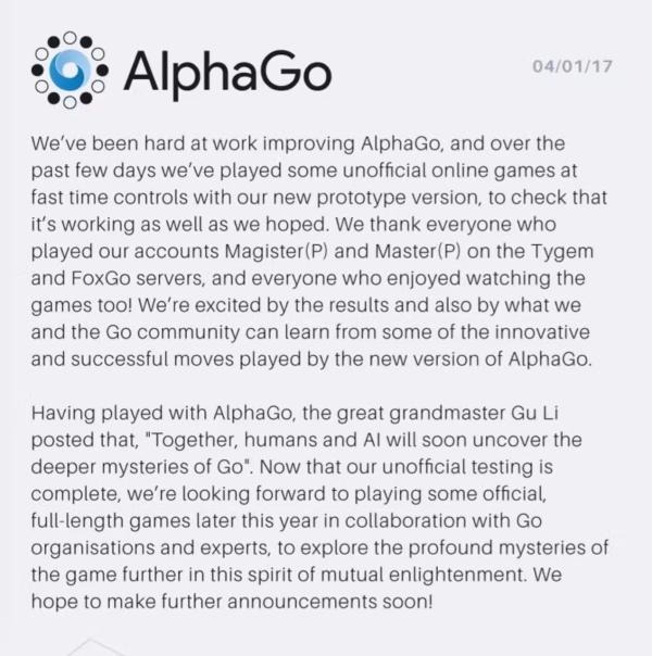 在古力下当天最后一盘时,Master终于公布自己身份,即谷歌公司开发的AlphaGo的升级版。它在弈城、野狐各下30盘棋后会暂时退隐江湖,稍后会有正式的慢棋比赛以及与人类高手共同研究、开发围棋项目。古力不出意外地败北,让Master取得60连胜的传奇和60张精彩棋谱。