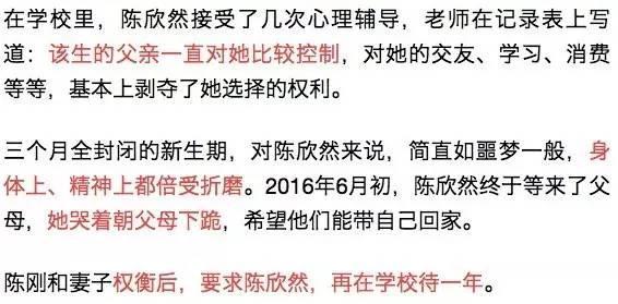 夫妻俩试图找出女儿言行大变的原因,他们跟踪女儿,给女儿朋友的父母打电话,这让陈欣然十分反感:“我没有一点隐私,没有一点空间 还没有一个朋友。”