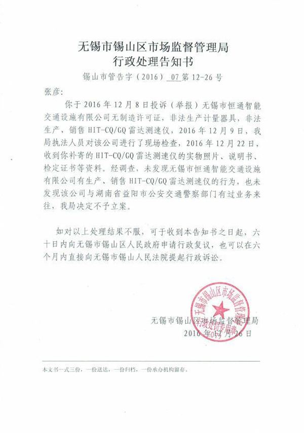 让人意想不到的是,2016年12月26日,该局向张彦寄来了锡山市管告字(2016)07第12-26号“行政处理告知书”,称该局执法人员对无锡恒通公司进行了现场检查,经调查,未发现该公司“有生产、销售HIT-CQ/GQ雷达测速仪的行为”,也未发现该公司“与湖南省益阳市公安交通警察部门有过业务来往”。所以,对于张彦投诉的该公司“无许可证非法生产”,决定不予立案。