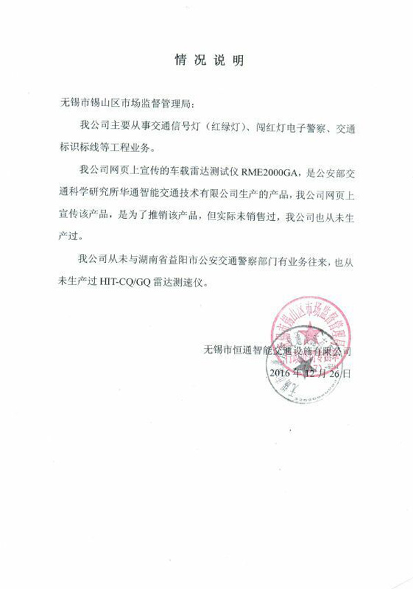 而无锡恒通公司向锡山区市场监督管理局提供的“情况说明”表明,该公司网页上宣传的车载雷达测速仪是为了推销,实际未销售过,也从未生产过,“也从未生产过HIT-CQ/GQ雷达测速仪”。该公司相关人士向澎湃新闻证实,他们并没有生产雷达测速仪的许可证。