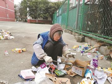 老人分拣垃圾非常仔细,她双手将地上的垃圾捡起,分拣出里面可以回收的饮料瓶和硬纸壳;遇到有学生吃剩下的馒头、包子,就将它们装在一旁的口袋里,带回去给学校住在附近乡村的工人拿回去喂鸡。