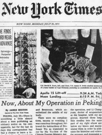 1971年7月,《纽约时报》专栏作家詹姆斯·赖斯顿在访华时,患了急性阑尾炎。术后第二天,腹部胀痛难忍,中国医生为他做了针灸治疗,效果显著。随后,赖斯顿在《纽约时报》头版发表了亲身经历针灸的文章,成为针灸传入美国的历史性标志。