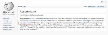 针灸是中国医学遗产的一部分,也是中华文化的一部分。但是,维基百科认为针灸属于伪科学,在针灸英文页面上赫然列明:“acupuncture is a pseudoscience” (针灸是伪科学)。