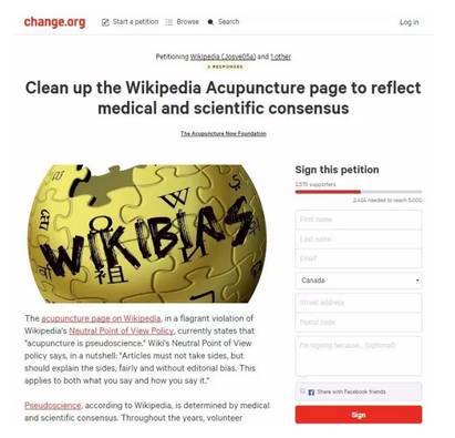 最近,有超过2500个中医师在请愿书网页签名抗议,要求维基为此更正。签名者并非只是华人,而是来自全世界各地不同族裔的医师和通过针灸治愈疾病的人。
