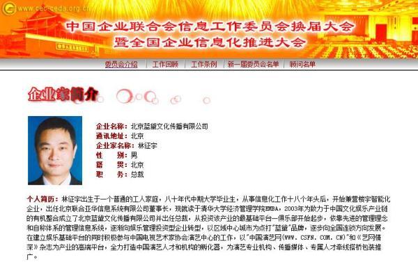 中国企业联合会官网介绍称:“林征宇出生于一个普通的工人家庭,八十年代中期大学毕业生,从事信息化工作十八个年头后,开始兼营楼宇智能化企业,出任北京联合亚华信息系统有限公司董事长,后就读于清华大学经济管理学院EMBA,2003年为致力于中国文化娱乐产业链的有机整合成立了北京蓝黛文化传播有限公司并出任总裁,从投资该产业的最基础平台一俱乐部开始起步,依靠先进的管理理念和自称体系的管理信息系统,逐渐向娱乐管理投资型企业转型,以区域中心城市为点打‘蓝黛’品牌,逐步向全国连锁方向发展。”