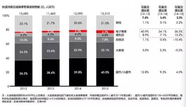 但线下零售并非全军覆没,作为一种即买即走并逐渐发展成为提供从票务到生活账单支付服务的一站式渠道,便利店的销售额与2014年同期相比增长了13%,其稳健增长与传统大卖场以及超市的萎靡不振形成了鲜明对比。