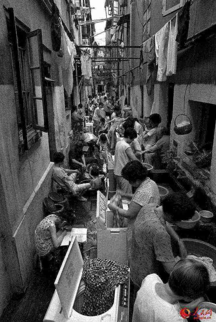 画面中,同样是一条下窄逼仄的弄堂,密密匝匝地挤满了三四十人。最前面并排放了三台洗衣机,也就一个转身的距离,站着三位洗衣服的女人。洗衣机旁边,一个小女孩趴在凳子上写作业。画面延伸,弄堂上面横七竖八地搭着洗好的衣服,挂着楼上吊下来的一个竹篓,而下面跟洗衣机挤在一起的,还有打盹的大爷,坐在澡盆里洗澡的孩子以及洗菜的大妈们……