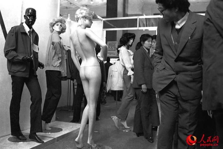80年代的上海,处于改革开放的前沿。上海虽然历经繁华,公开的裸体艺术展还是吸引了大量男性。“那时候,如果有人手里有一张裸体画册会被定为有罪。有人传播这些东西,会被判刑,有劳动改造。”龚建华回忆说。他指着另外一幅作品,也展示了当时民众公开接触以及参与性话题的反应。“1988年,上海服装展上,一位中年人斜着眼睛偷瞄裸体塑料模特。画面的背景也有两个人,他们的眼神也很有意思。”这名戴着眼镜、身穿西装的男子,在走过一具尚未穿好展示服装的裸体塑料模特后,回头去看。