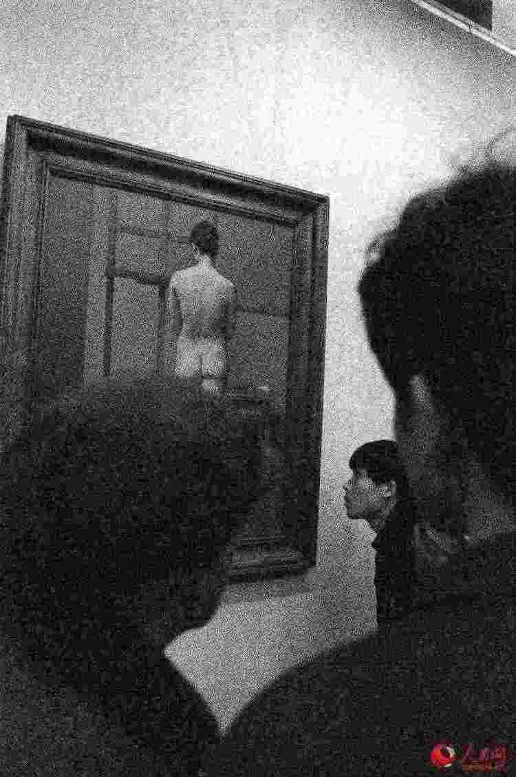 “这是我拍的1988年上海第一届裸体油画艺术展。在展出的当天,看展的人都是男性。在展厅的一角,一位年轻人,正认真地看着一幅油画,他的目光伸向了油画的背面。”