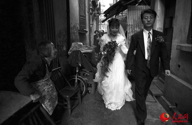 “1995年,我在上海帮朋友拍结婚照,在拍摄的瞬间我抓住了一张非常有意义的照片。一对新婚夫妇从弄堂里走出来,一位阿婆目送他们。”