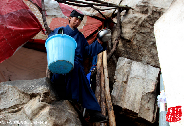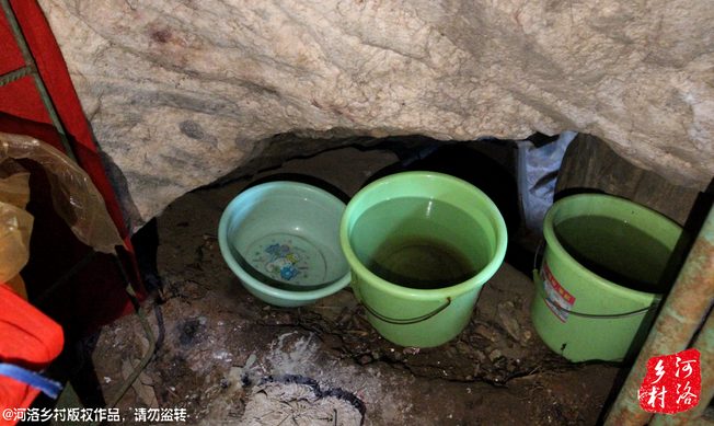 吃水也是个麻烦事,他的小棚子倚靠的山洞石头往下滴水,他就用桶接了储存,之前是在洞里住,由于潮湿,才搭建了这个简陋的棚子。