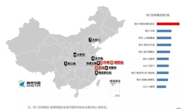 平时没时间出游,春节连放七天不想宅?准备出游的你要注意了:据《报告》分析,从南北方自驾景区热度排名上看,南方景区的出行明显高于北方。在TOP10排名榜单上边,南方占据了9席,西湖、 外滩、城隍庙排名前三。北方仅有北京的天安门以及西安的大雁塔进入榜单,排名第7位和第10位。