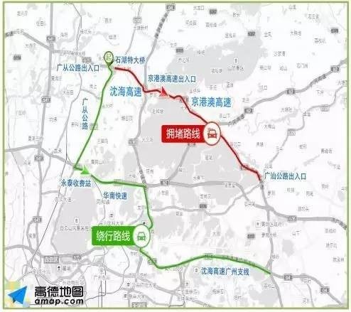 【绕行路线】:从广从公路出入口下高速,沿广从公路行驶,在永泰收费站上华南快速-沈海高速广州支线行驶,转向京港澳高速。