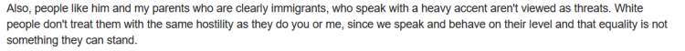 像他和我们父母明显是移民,他们有严重的口音,并不被看成是一种威胁。(白人)对待他们并不像对我们那样充满敌意,因为我们的讲话和举止与白人在一个层次上而这种平等是他们不能容忍的。