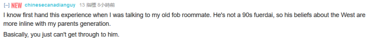我能理解这些经历当我与我以前的新移民室友谈话的时候。他不是90后富二代,但他对西方的想法与我们父母那一辈的人更像。基本上,你不可能理解他。