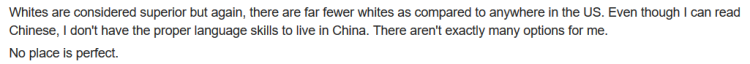 白人被认为是优越的,但是世界上其他地方的白人相对于美国来说是大大减少的。即使我能阅读中文,我没有能够居住在中国的合适的语言。对我来说没有很多的选择。没有地方是完美的。
