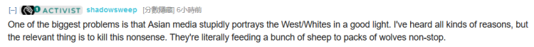 最大的问题是亚洲的媒体愚蠢地从好的角度描述西方/白人。我听说过各种各样的原因,但要紧的事是消灭这种无稽之谈。这些媒体简直在驯养一群送入狼口中的羊。