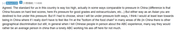 同意。这个国家对我们的标准设置得太高,从某种程度上来说可以比得上在中国(不同之处是中国关注硬性的考试分数,而在这里面临对好成绩和课外表现的压力)。无论哪种方式作为一个亚洲人你都注定要在这样的压力下生活,但是如果我必须选一个的话,我更偏向于生活在中国,在那里我不必感觉到自己在生活的多方面都生活在“食物链的底端”。在中国,有其他地理歧视,但是总体来说当我给中国人当面讲作为一个华裔二代的经历时,他们中的很多人会说他们宁愿在中国做一个普通人而不是做一个孤独的华裔二代,拼了命而获得很少。