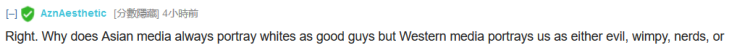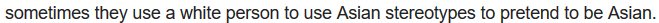对。为什么亚洲的媒体总是把白人描述成好人而西方媒体把我们描述成要么邪恶、懦弱、书呆子,要么他们用亚洲的刻板形象把自己装成亚洲人。