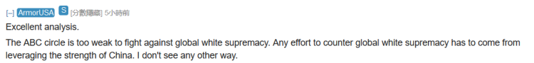 精彩的分析。华裔二代群体太弱了,根本不能与全球白人至上做抗争。任何抗击全球白人至上的努力必须来自中国的平衡杠杆。我看不到其他的任何方式。