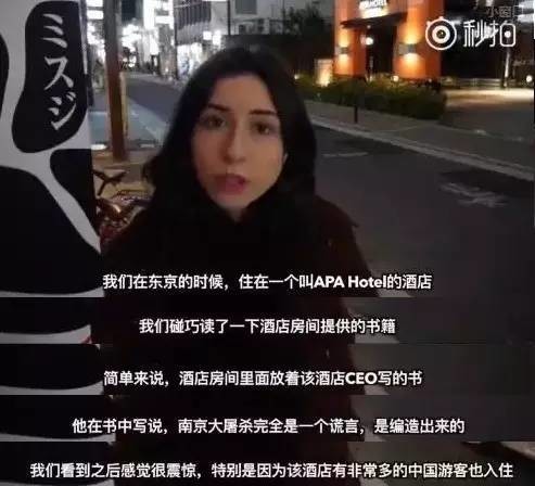 视频中,Kat表示:“这位日本老板可以在自己的酒店放自己的书,相信自己所相信的东西,但是他赚了中国和韩国游客的钱,却不让游客知道自己的政治观点和房费落入了什么样的一个人的口袋中,这让我觉得,这种行为真的很不尊重人,很不诚实。”