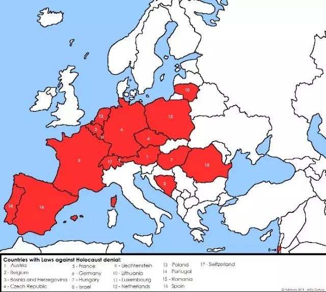 ▲图中标红的国家都拥有相关法律,会严惩那些发表 “否认纳粹大屠杀言论”的人