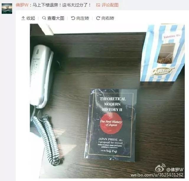 在阿帕酒店的每一个房间里,都放了该酒店集团CEO元谷外志雄写的三本右翼书籍:《自豪的祖国日本——为复兴日本谏言》、元谷外志雄和日本航空自卫队前司令田母神俊雄的对谈录《无法言说的国家论》以及《真正的日本历史——理论近现代史学》(作者“藤诚志”是元谷外志雄的笔名)。