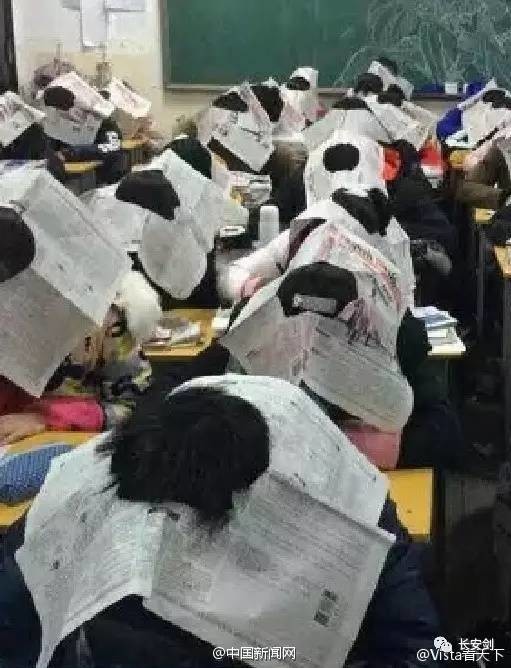 2、生无可恋!为防作弊,学生被要求头戴报纸考试近日,安徽滁州某中学教师被曝为防学生作弊想出“高招”:要求学生头戴处理过的报纸。这名教师还将现场照片发至空间,感慨“以前怎么没想到”。(@北京青年报)