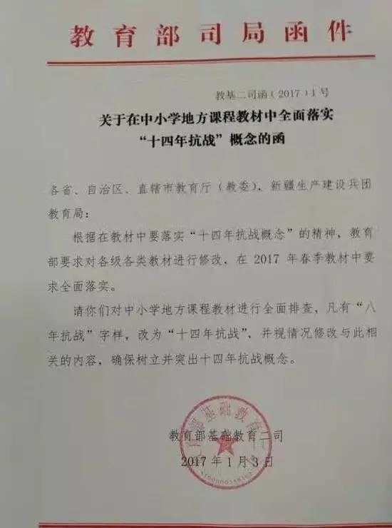 《关于在中小学地方课程教材中全面落实“十四年抗战”概念的函》函件